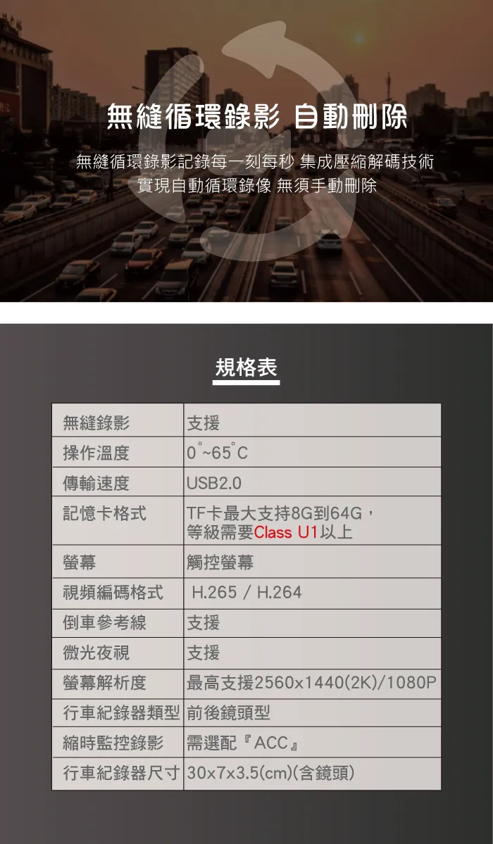 無縫循環錄影 自動刪除無縫循環錄影記錄每一刻每秒 集成壓縮解碼技術實現自動循環錄像 無須手動刪除規格表無縫錄影支援操作溫度°~65°C傳輸速度USB2.0記憶卡格式螢幕 TF卡最大支持8G到64G,等級需要Class U1以上觸控螢幕視頻編碼格式H.265/H.264倒車參考支援微光夜視支援螢幕解析度最高支援2560x1440(2K)/1080P行車紀錄器類型 前後鏡頭型縮時監控錄影 需選配『ACC』行車紀錄器尺寸 30x7x3.5(cm)(含鏡頭)