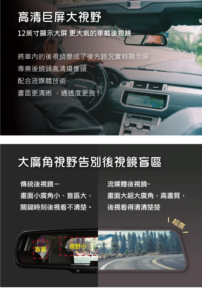 高清巨屏大視野12英寸顯示大屏更大氣的車載後視鏡將車內的後視鏡變成了後方路況實時顯示屏專業後鏡頭高清攝像頭配合流媒體技術畫面更清晰通透度更強!大廣角視野告別後視鏡盲區傳統後視鏡流媒體後視鏡-畫面小廣角小、盲區大,關鍵時刻後視看不清楚。畫面大超大廣角,高畫質,後視看得清清楚楚 超廣視野小