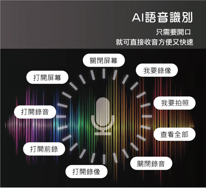 AI語音識別只需要開口就可直接收音方便又快速關閉屏幕我要錄像打開屏幕打開錄音打開前錄打開錄像我要拍照查看全部關閉錄音