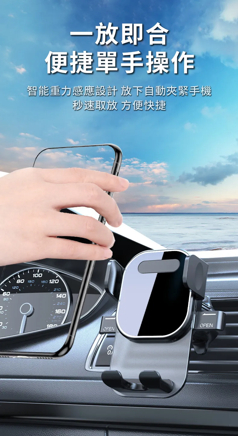 90-一放即合便捷單手操作智能重力感應設計 放下自動夾緊手機秒速取放 方便快捷12010080 150 120210140240160270180OPEN
