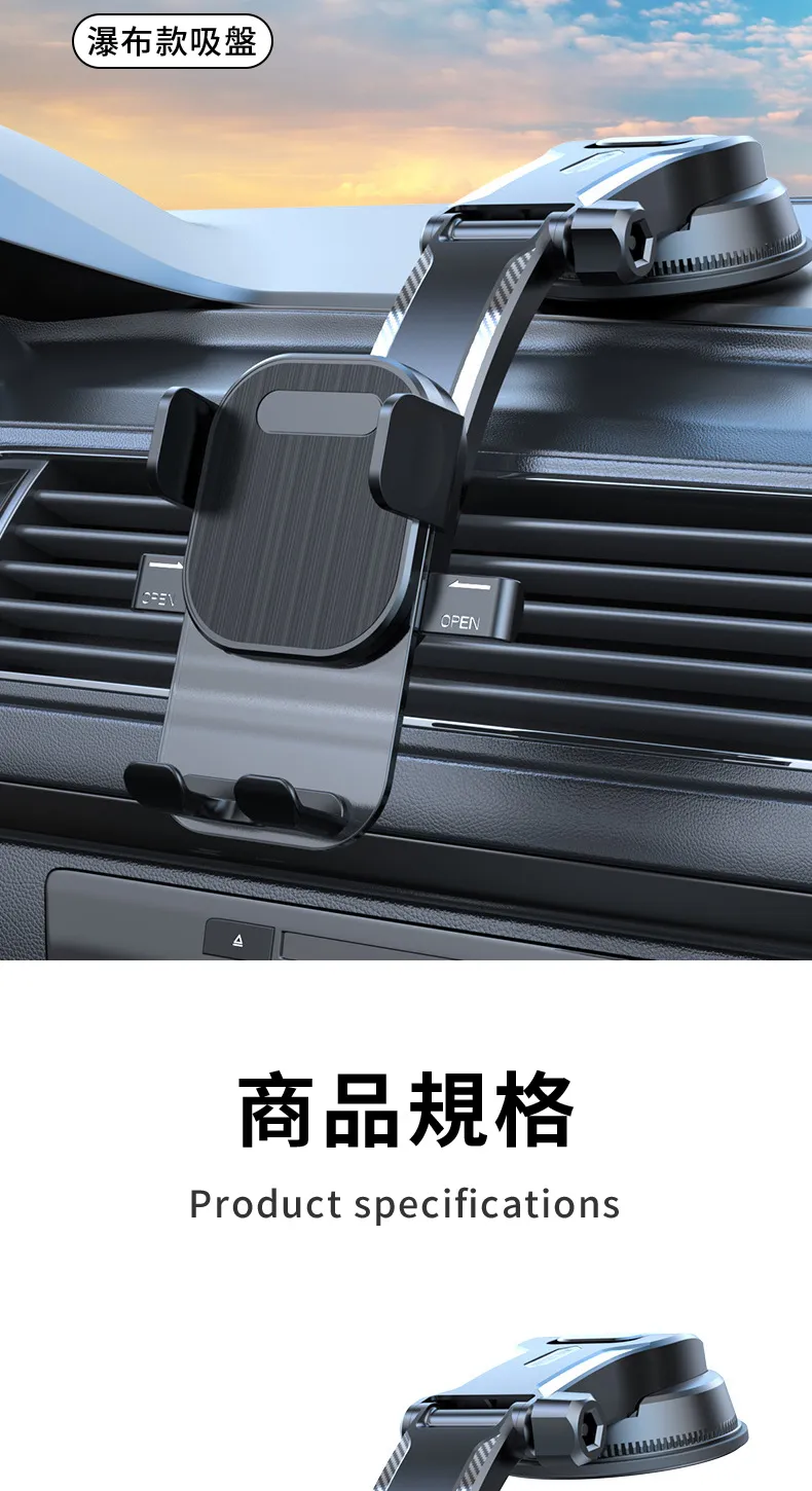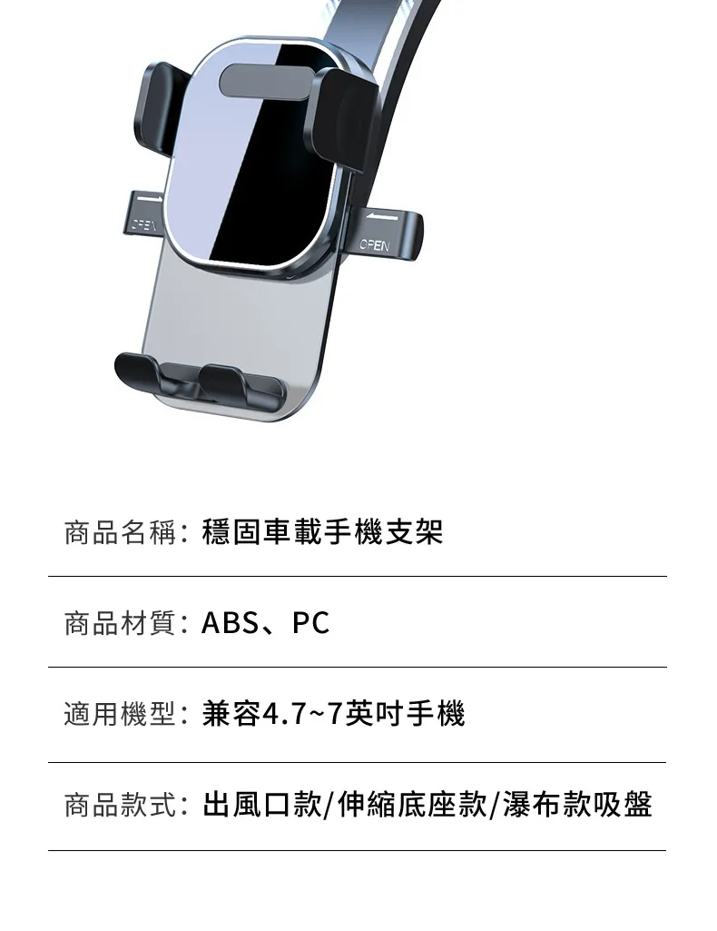 商品名稱:穩固車載手機支架商品材質:ABS、PC適用機型:兼容4.7~7英吋手機商品款式:出風口款/伸縮底座款/瀑布款吸盤