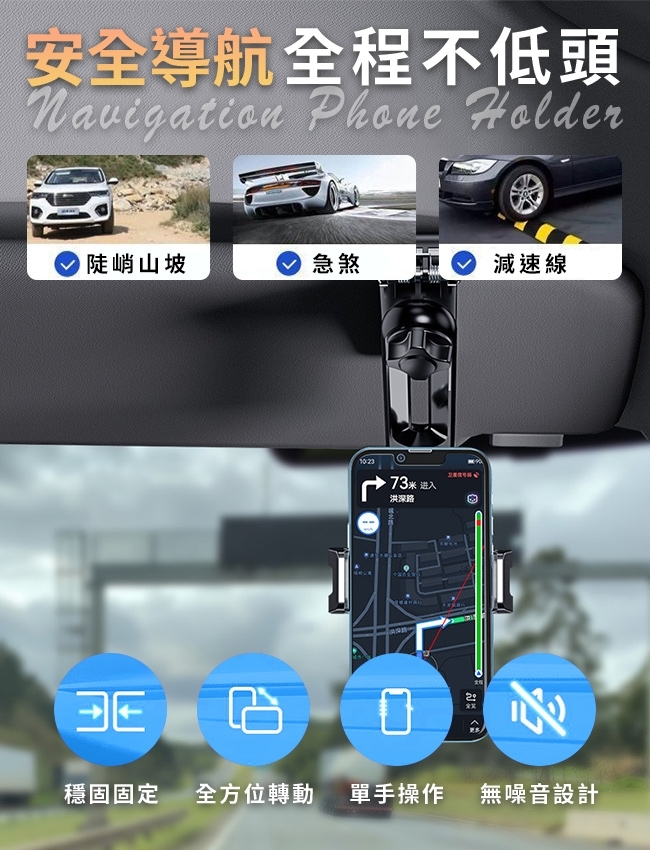 安全導航全程不低頭 Holder陡峭山坡急煞減速線73米 进入洪深路穩固固定全方位轉動 單手操作無噪音設計