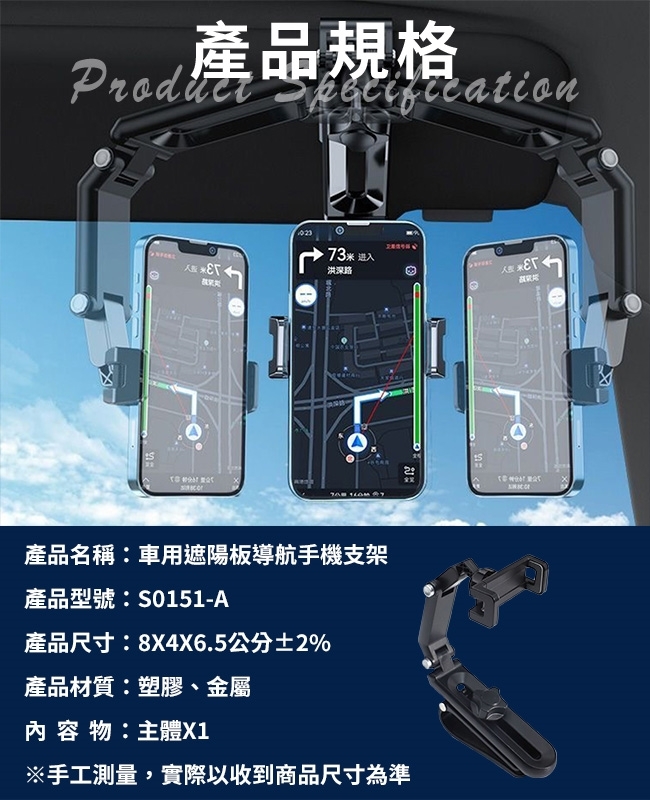 產品規格 73米 进入洪深路產品名稱:車用遮陽板導航手機支架產品型號:S0151-A產品尺寸:8X4X6.5公分±2%產品材質:塑膠、金屬內容物:主體X1※手工測量,實際以收到商品尺寸為準