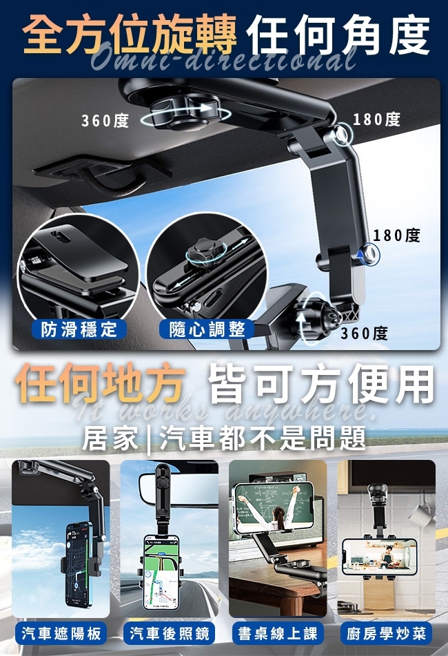 全方位旋轉 任何角度360度180度180度防滑穩定隨心調整360度任何地方 皆可方便用居家|汽車都不是問題汽車遮陽板 汽車後照鏡 書桌線上課 廚房學炒菜