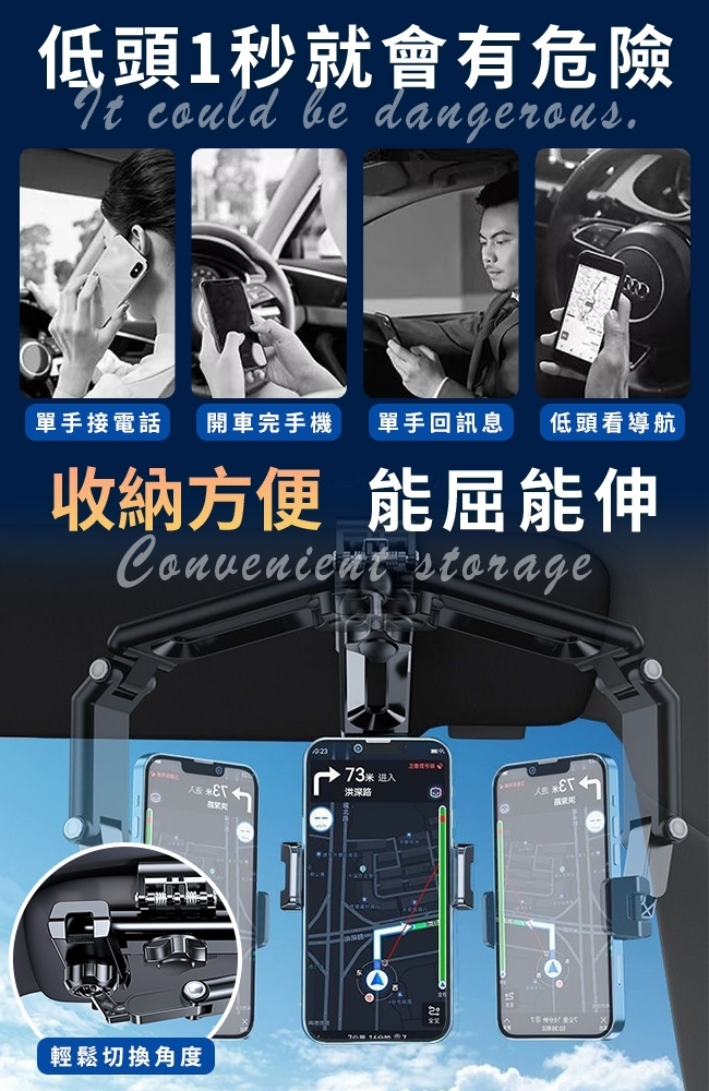 低頭1秒就會有危險It could be dangerous.單手接電話開車完手機 單手回訊息 低頭看導航收納方便 能屈能伸Convenient storage輕鬆切換角度73米 进入洪深路
