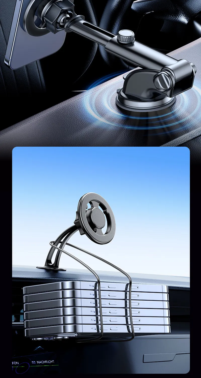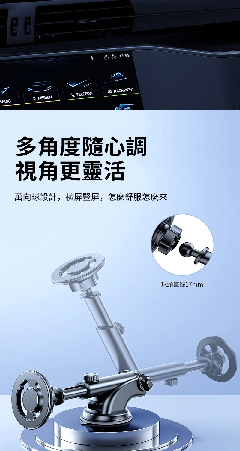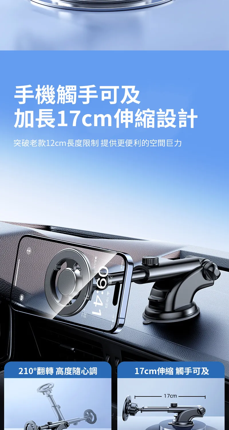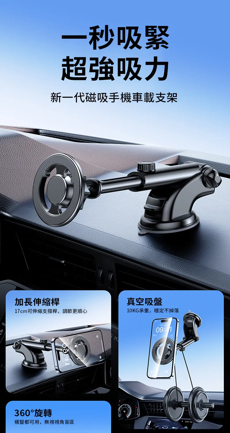 一秒吸緊超強吸力新一代磁吸手機車載支架加長伸縮桿真空吸盤17cm可伸縮支撐桿,調節更順心10KG承重,穩定不掉落360°旋轉橫豎都可用,無視視角盲區09:41