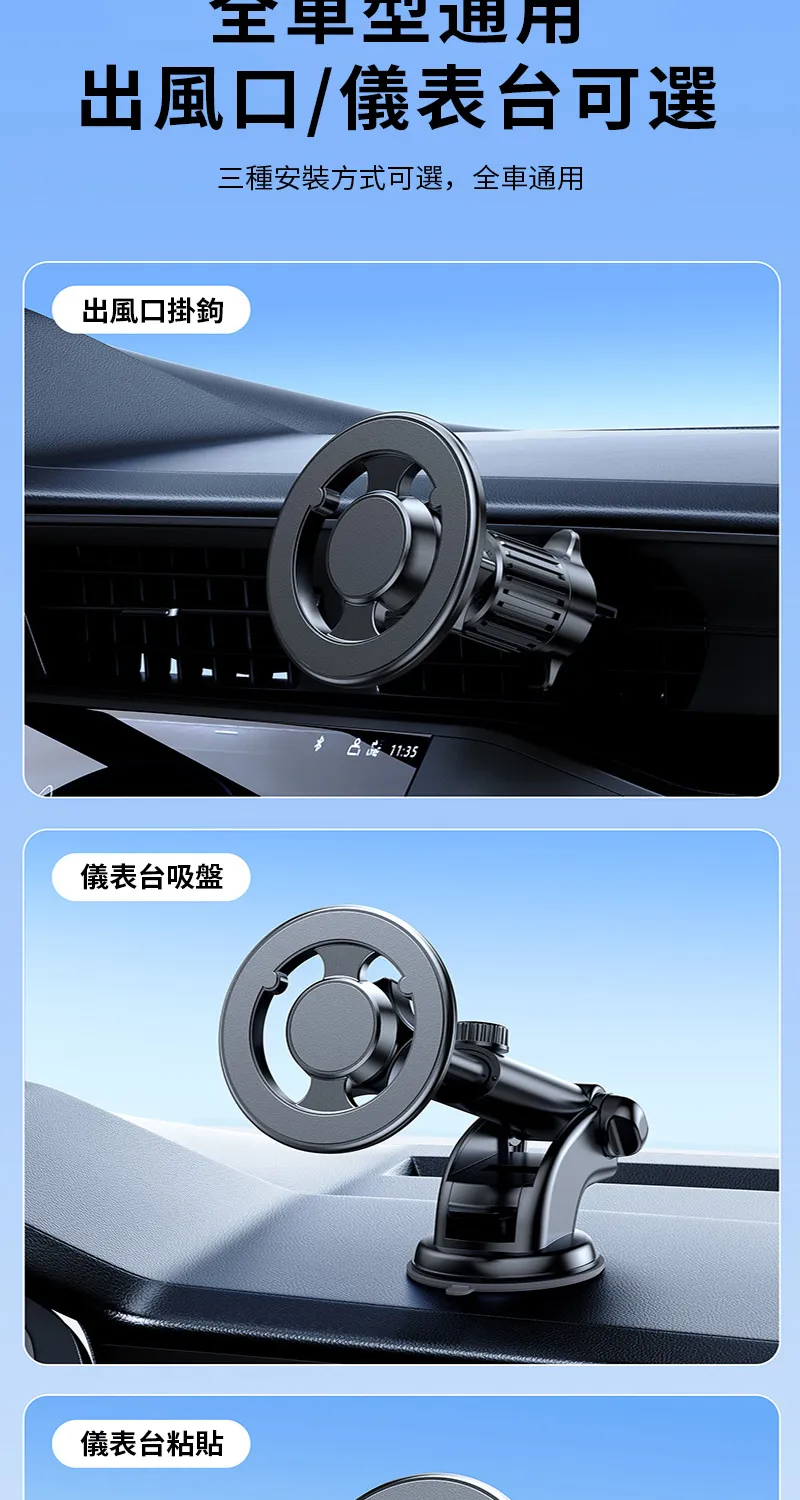 出風口/儀表台可選三種安裝方式可選,全車通用出風口掛鉤儀表台吸盤儀表台粘貼 11:35