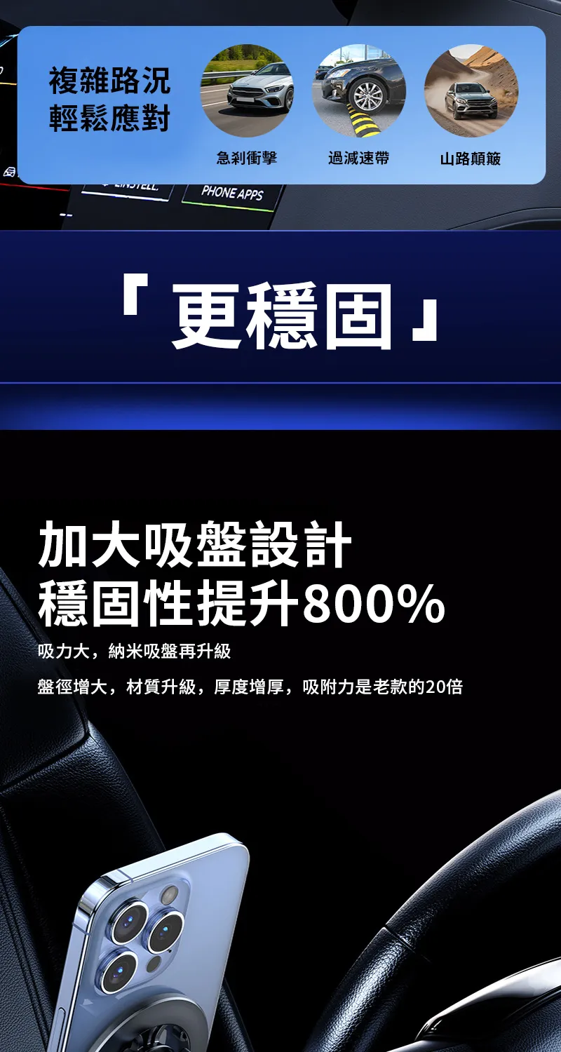 複雜路況輕鬆應對急剎衝擊過減速帶山路顛簸PHONE APPS更穩固加大吸盤設計穩固性提升800%吸力大,納米吸盤再升級盤徑增大,材質升級,厚度增厚,吸附力是老款的20倍