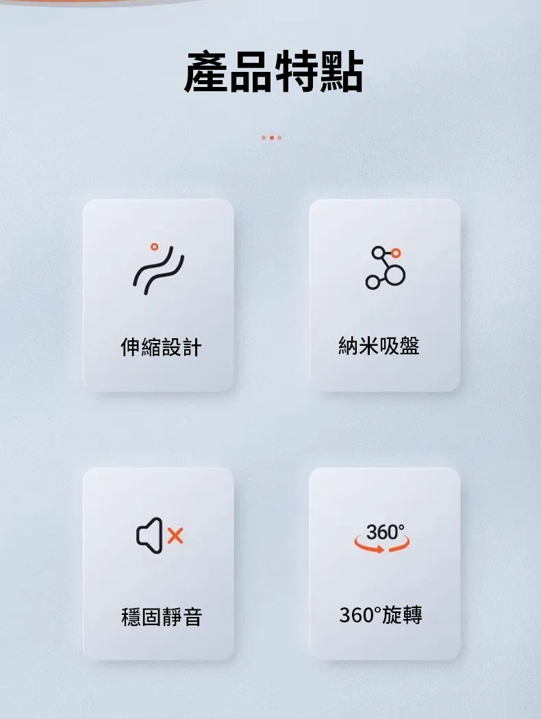 產品特點伸縮設計納米吸盤360穩固靜音360°旋轉