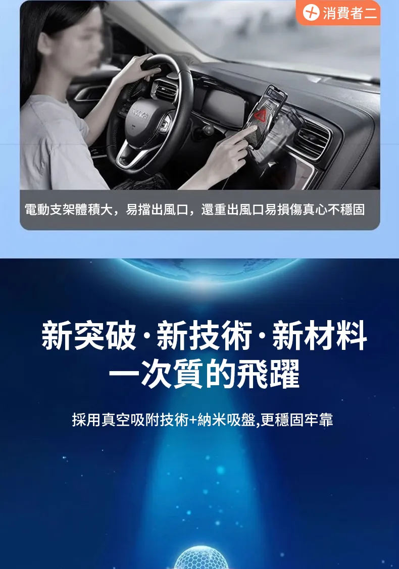 消費者二電動支架體積大,易擋出風口,還重出風口易損傷真心不穩固新突破·新技術·新材料一次質的飛躍採用真空吸附技術+納米吸盤,更穩固牢靠