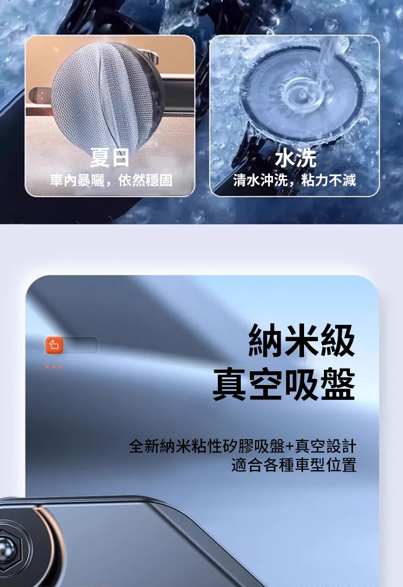 夏日水洗暴曬,依然穩固清水沖洗,粘力不減納米級真空吸盤全新納米粘性矽膠吸盤+真空設計適合各種車型位置