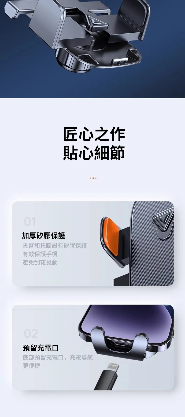 01加厚矽膠保護匠心之作貼心細節臂和托腳設有矽膠保護有效保護手機避免刮花晃動02預留充電口底部預留充電口,充電導航更便捷