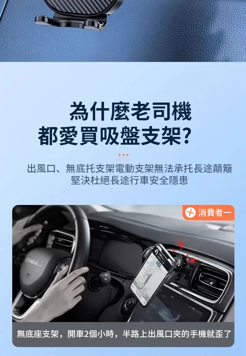 為什麼老司機都愛買吸盤支架?出風口、無底托支架電動支架無法承托長途顛簸堅決杜絕長途行車安全隱患消費者一無底座支架,開車2個小時,半路上出風口夾的手機就歪了