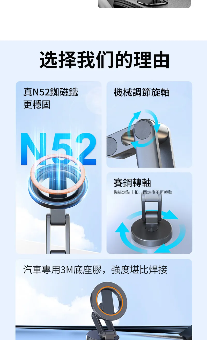 选择我们的理由真N52銣磁鐵機械調節旋軸更穩固N52賽鋼轉軸機械定點卡扣,固定後不再轉動汽車專用3M底座膠,強度堪比焊接