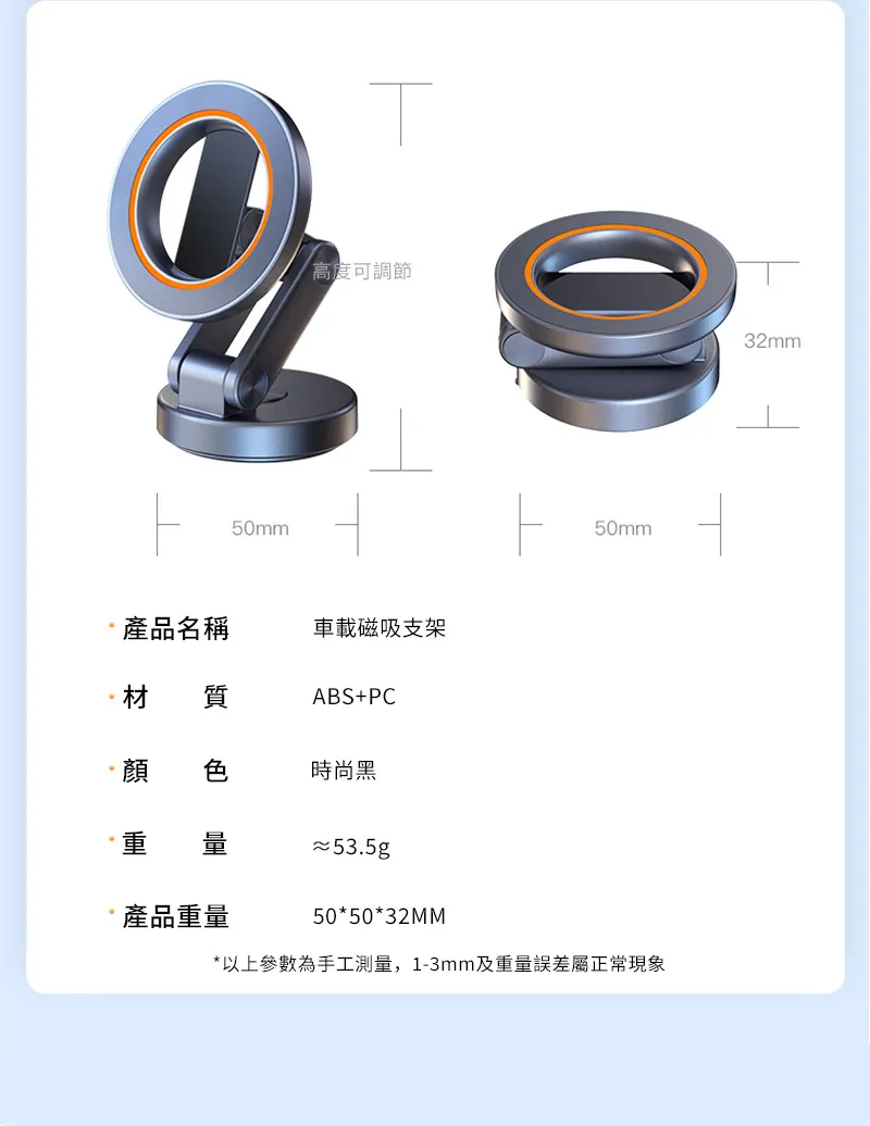50mm可調節產品名稱車載磁吸支架材 質ABS+PC顏 色時尚黑重≈53.5gp產品重量50mm50*50*32MM*以上參數為手工測量,1-3mm及重量誤差屬正常現象32mm