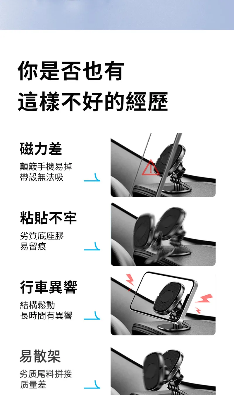 你是否也有這樣不好的經歷磁力差顛簸手機易掉帶殼無法吸粘貼不牢劣質底座膠易留痕行車異響結構鬆動長時間有異響易散架劣质尾料拼接质量差1