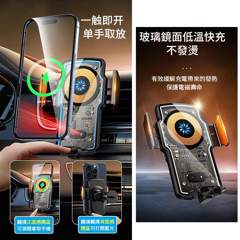 %觸摸正面感應區可張開拿取手機一触即开单手取放 玻璃鏡面低溫快充觸摸觸摸背面感應區可打開藍光不發燙有效緩解充電帶來的發熱保護電磁壽命