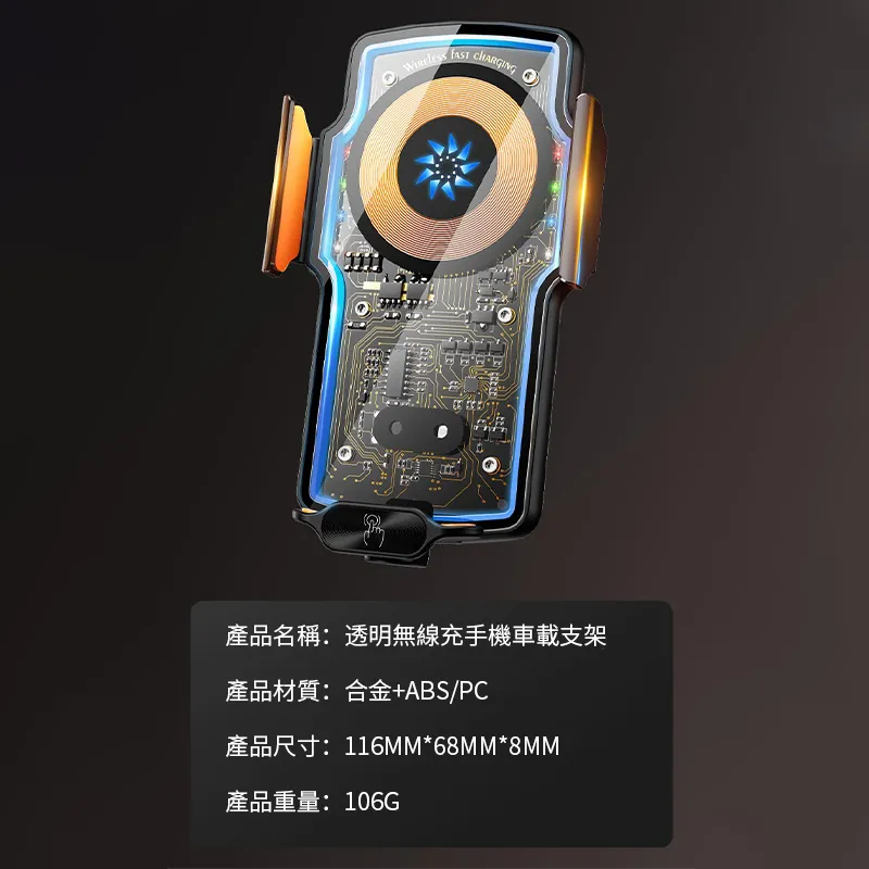 產品名稱:透明無線充手機車載支架產品材質:合金+ABS/PC產品尺寸:116MM*68MM*8MM產品重量:106G