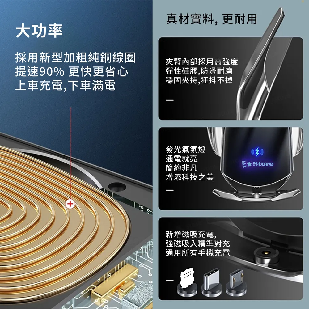 大功率採用新型加粗純銅線圈提速90% 更快更省心上車充電,下車滿電真材實料,更耐用夾臂內部採用高強度彈性硅膠,防滑耐磨穩固夾持,狂抖不掉發光氣氛燈通電就亮簡約非凡增添科技之美新增磁吸充電,強磁吸入精準對充通用所有手機充電