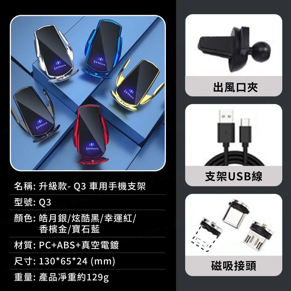EEEStore出風口夾支架USB線名稱: 升級款- Q3 車用手機支架型號: Q3顏色: 皓月銀/炫酷黑/幸運紅/香檳金/寶石藍材質:PC+ABS+真空電鍍尺寸: 130*65*24 (mm)重量: 產品凈重約129gstore 磁吸接頭