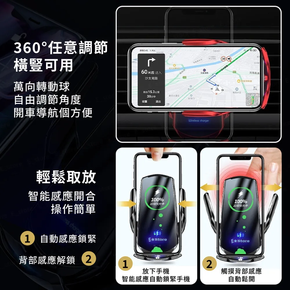 360任意調節橫豎可用萬向轉動球自由調節角度開車導航個方便 60米 进入5.3公里°设置re store sto輕鬆取放智能感應開合 100%100%超级超级快中 store操作簡單 1 自動感應鎖緊E背部感應解鎖 212放下手機觸摸背部感應智能感應自動鎖緊手機自動鬆開