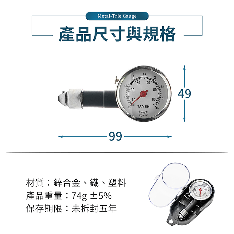 Metal-Trie Gauge產品尺寸與規格2530 402050491060 TAYEH材質:鋅合金、鐵、塑料產品重量:74g±5%保存期限:未拆封五年kg/