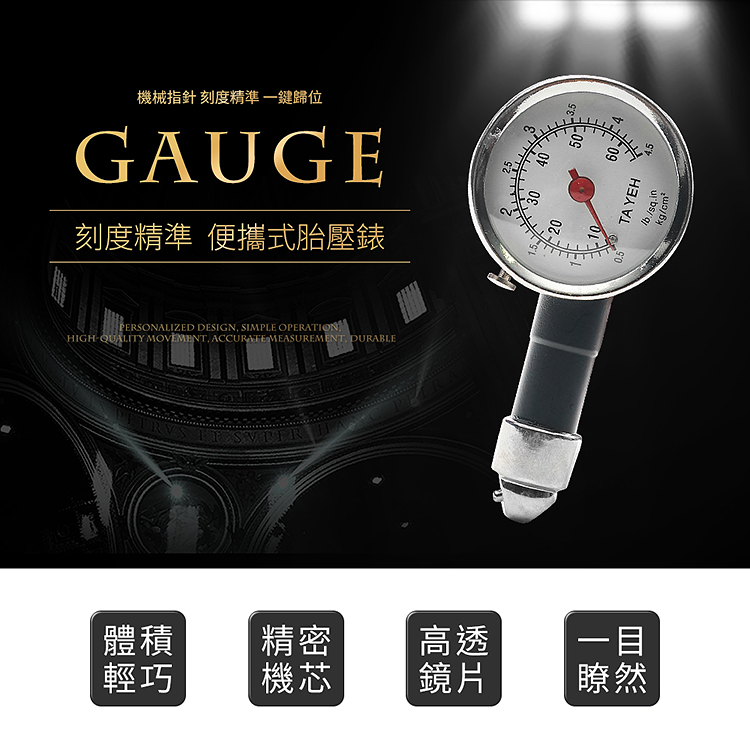 機械指針 刻度 一鍵歸位GAUGE刻度精準 便攜式胎壓錶PERSONALIZED DESIGN SIMPLE OPERATION\HIGH-QUALITY MOVEMENT ACCURATE MEASUREMENT DURABLE體積精密高透一目輕巧機芯鏡片瞭然203050TAYEHkg/