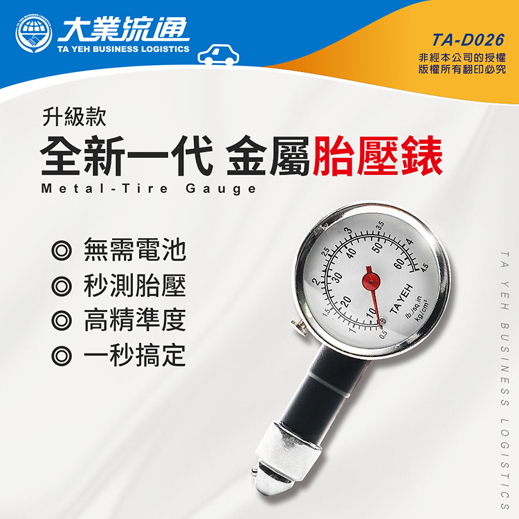 大業流通TA YEH BUSINESS LOGISTICSTAD026非經本公司的授權版權所有翻印必究全新一代 金屬胎壓錶升級款Metal-Tire Gauge 無需電池 秒測胎壓◎ 高精準度◎一秒搞定4030502060TA YEHkg/cm²TAYEH BUSINESSLOGISTICS