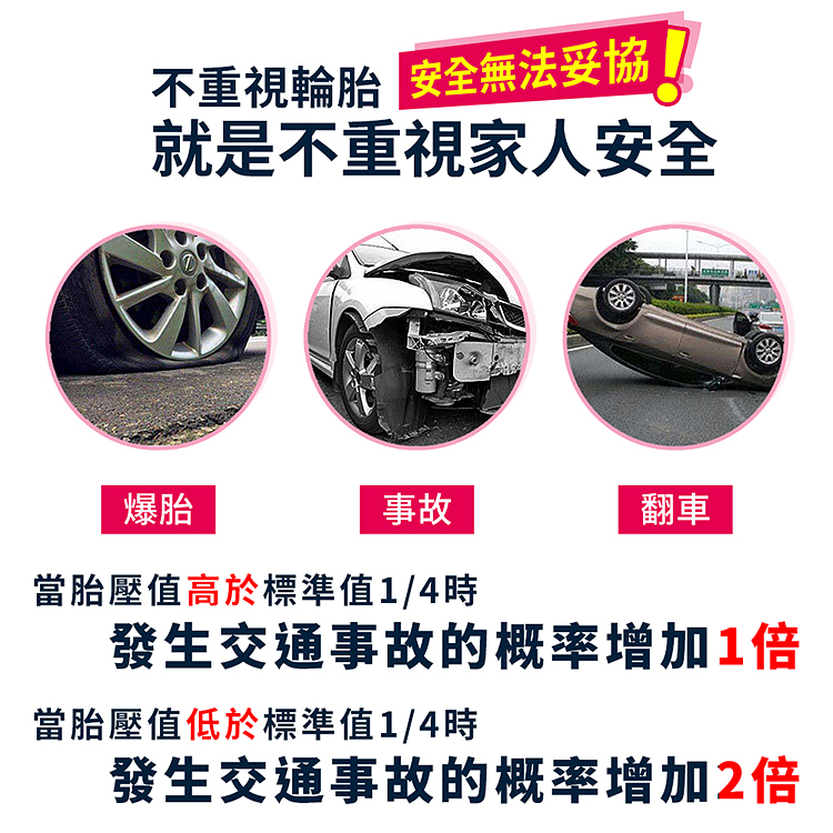 不重視輪胎 安全無法妥協就是不重視家人安全爆胎事故翻車發生交通事故的概率增加1倍當胎壓值高於標準值1/4時當胎壓值低於標準值1/4時發生交通事故的概率增加2倍