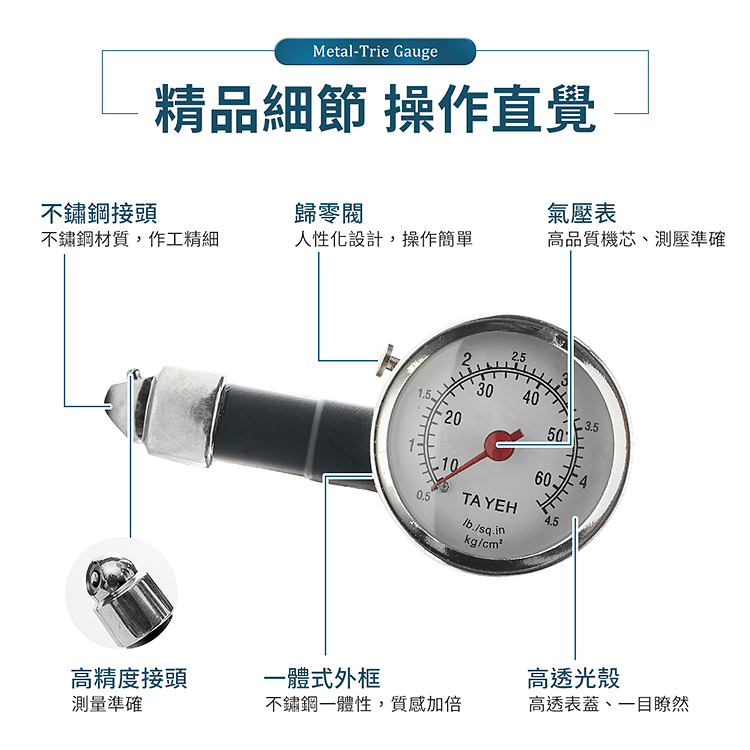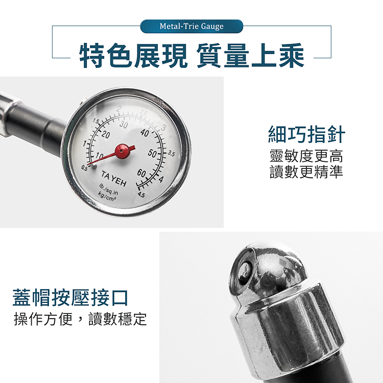 Metal-Trie Gauge特色展現 質量上乘304020 35501060.TAYEH4.5kg/cm²蓋帽按壓接口操作方便,讀數穩定細巧指針靈敏度更高讀數更精準